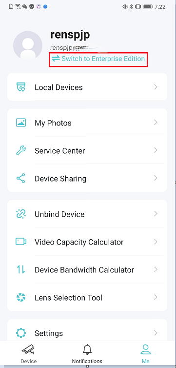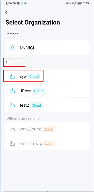 Adım 2. VIGI uygulamasında (Kişisel Sürüm) zaten oturum açtıysanız, hesabınıza gidin, Kurumsal Sürüme Geç öğesine dokunun , bir kuruluş seçin ve VIGI cihazlarını görüntülemek için bir site seçin.