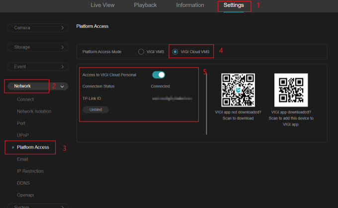 Adım 1. Ayarlar > Ağ > Platform Erişimi > VIGI Cloud VMS’ye gidin ve ardından TP-LINK Kimliğinizi NVR’ye bağlayın.