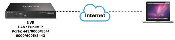 Yapılandırma adımları Senaryo 1’deki adımlara benzerdir; ancak 3. ve 4. Adımlar atlanabilir; çünkü bu senaryodaki NVR’nin zaten genel bir IP adresi vardır ve UPnP bağlantı noktası eşlemesine ihtiyaç duymaz.