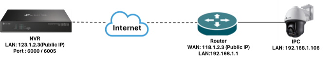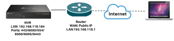 NVR’nin IP adresi Özel bir IP adresidir. NVR’ye bağlı yönlendiricinin Genel bir IP adresi olmalıdır. Bu arada, yönlendiricinin Yönetim Portu ve Uzak Akış Portunu UPnP veya diğer yöntemleri (örneğin, yönlendiricinin port yönlendirme özelliği) kullanarak genel ağa eşlemesi gerekir. Tipik bir topoloji diyagramı aşağıdaki gibidir: