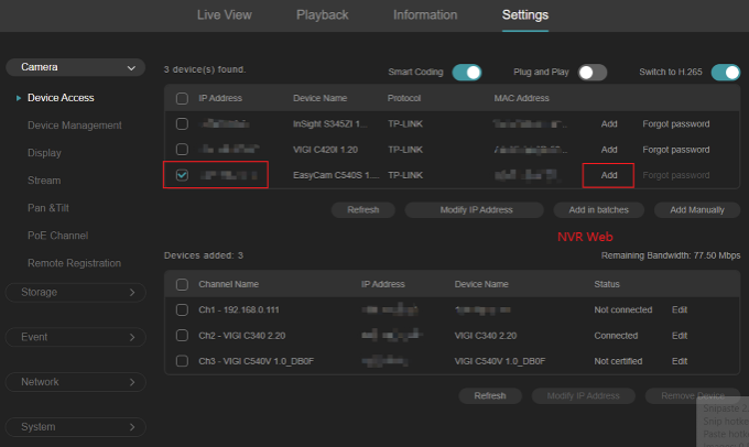 Ayarlar > Kamera > Cihaz Erişimi’ne gidin ve IPC’yi NVR Web arayüzüne ekleyin.