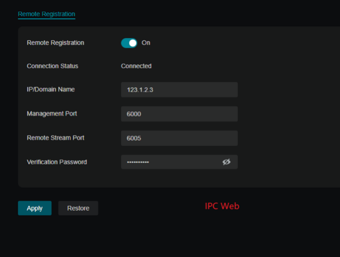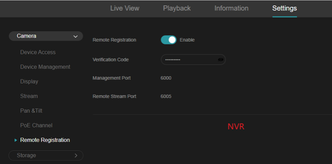 IPC’yi NVR bilgileriyle yapılandırın. NVR’nin genel IP adresini (veya DDNS destekli Alan Adını), bağlantı noktasını ve doğrulama kodunu girin.