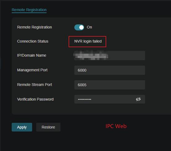 IPC bağlantısı başarısız olduğunda, IPC’nin web arayüzündeki Bağlantı Durumu ‘NVR oturum açma başarısız’ mesajını görüntüler.