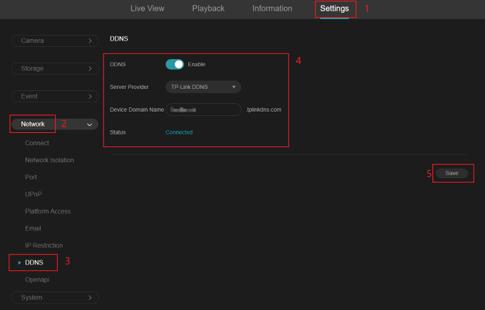 Adım 2. Ayarlar > Ağ > DDNS’ye gidin , DDNS’yi etkinleştirin , Servis Sağlayıcı: TP-Link DDNS’yi seçin, Cihaz Alan Adı’nı girin ve ardından ‘Kaydet’e tıklayın. Son olarak, Durum bağlanacaktır.